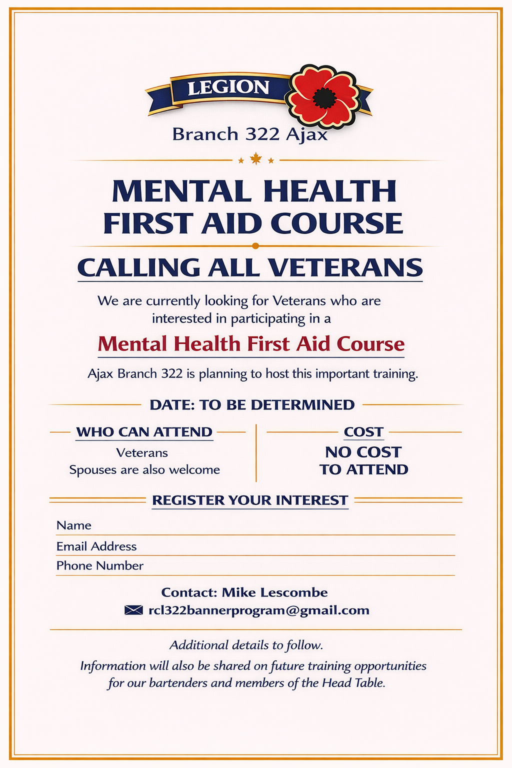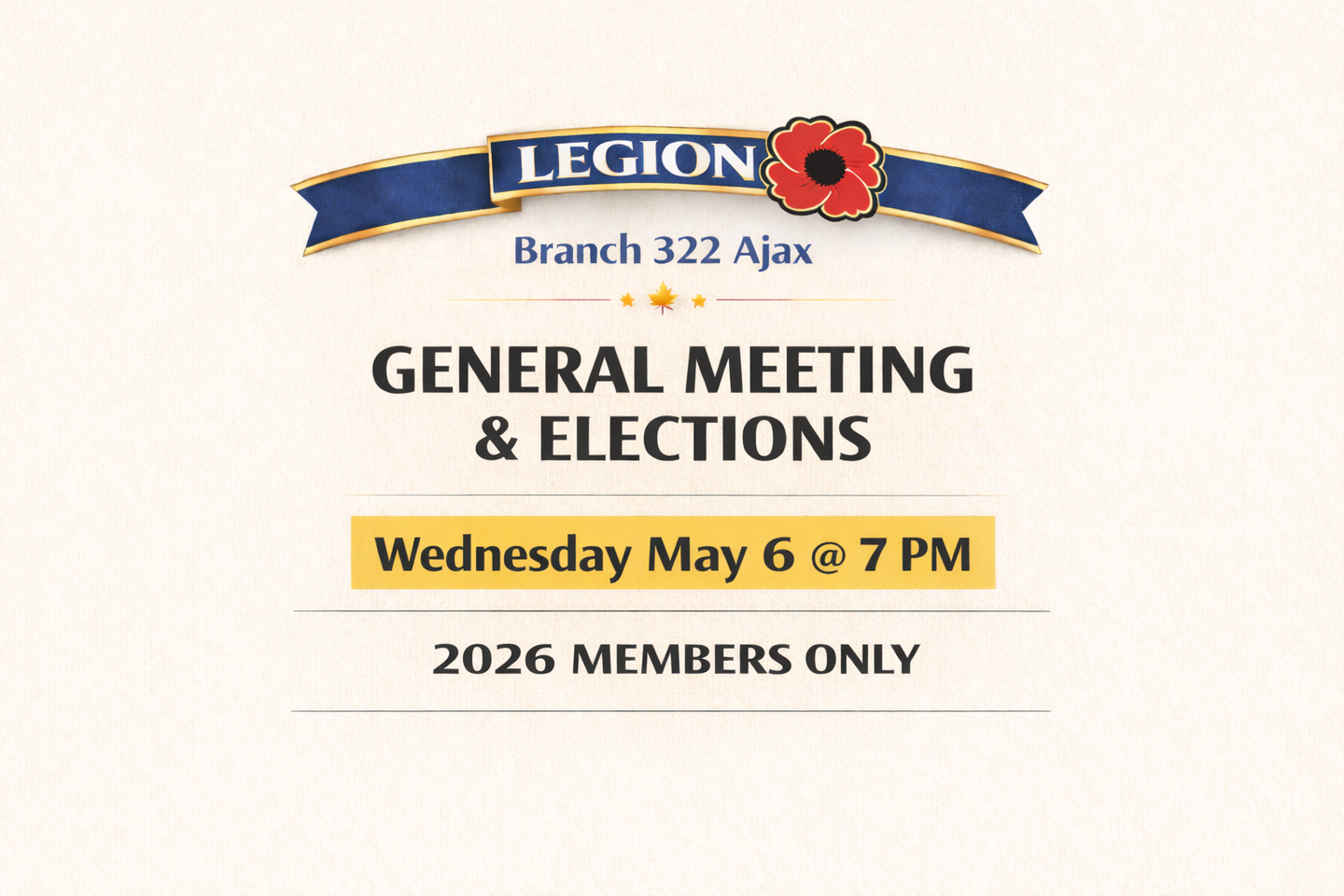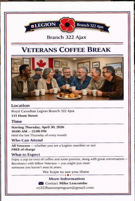 The Royal Canadian Legion Branch 322 serves Veterans, military families, RCMP members, and the community of Ajax through programs, support services, remembrance initiatives, and year-round events. Known as “The Friendly Branch,” Branch 322 remains committed to honouring Veterans and strengthening community connections.