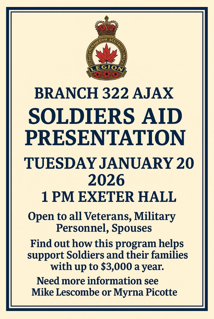 The Royal Canadian Legion Branch 322 serves Veterans, military families, RCMP members, and the community of Ajax through programs, support services, remembrance initiatives, and year-round events. Known as “The Friendly Branch,” Branch 322 remains committed to honouring Veterans and strengthening community connections.