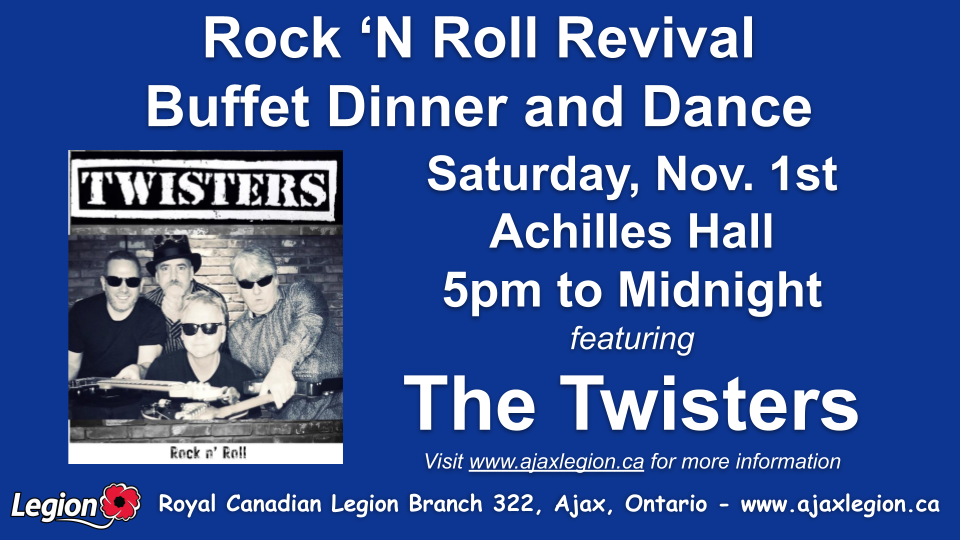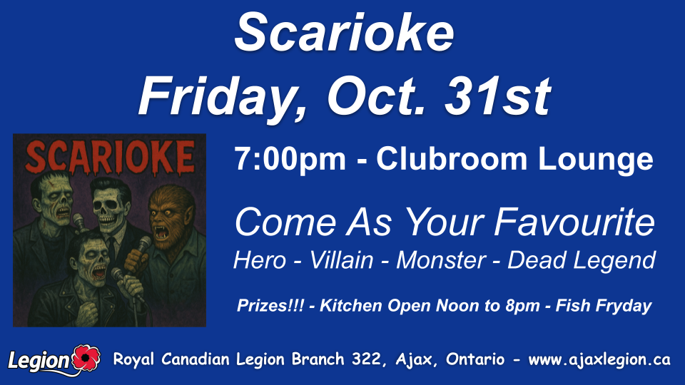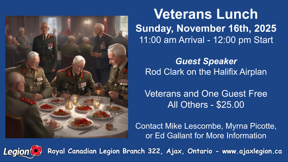 Royal Canadian Legion Branch 322 in Ajax, Ontario supports Canadian Troops, Veterans, their families, and the local community by raising funds through events, hall rentals, and clubroom sales.