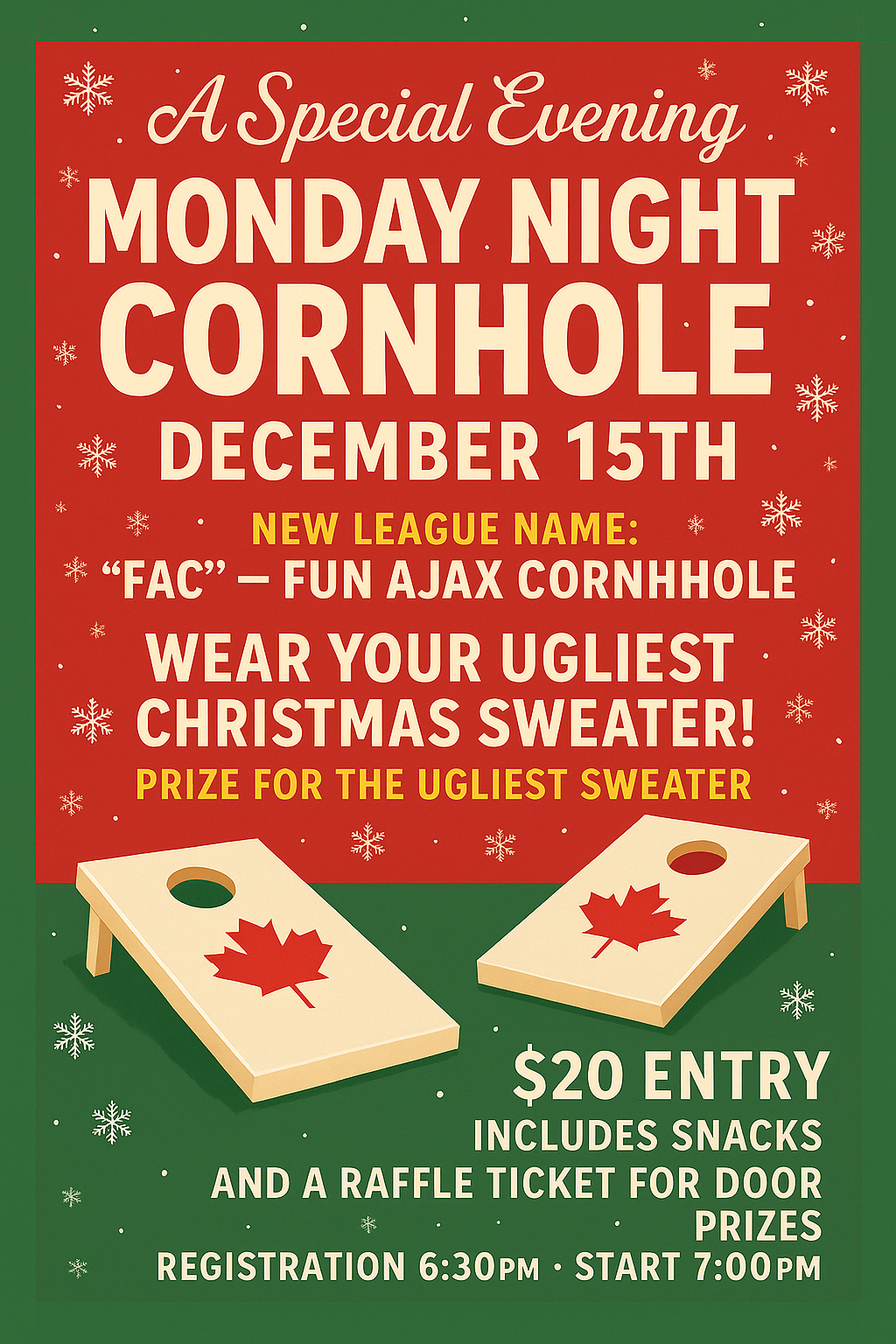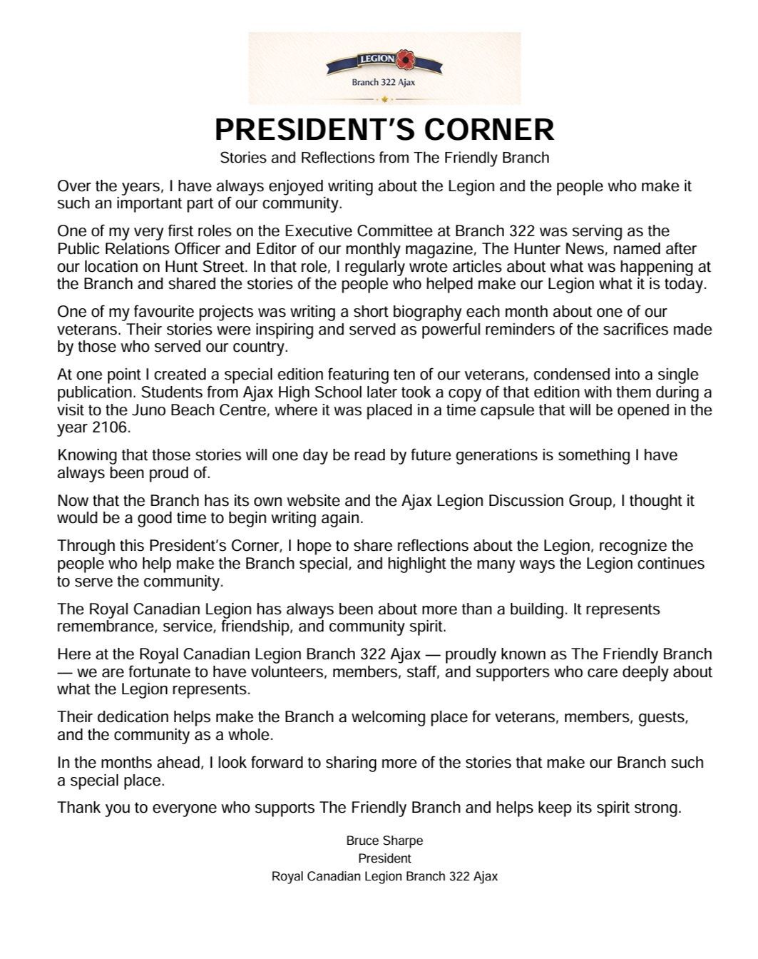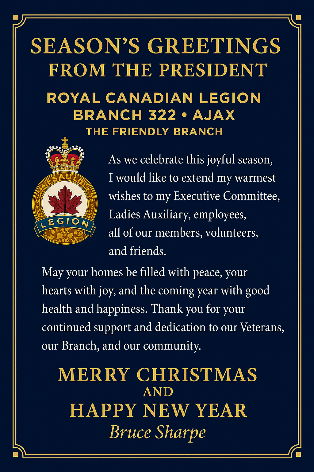 The Royal Canadian Legion Branch 322 serves Veterans, military families, RCMP members, and the community of Ajax through programs, support services, remembrance initiatives, and year-round events. Known as “The Friendly Branch,” Branch 322 remains committed to honouring Veterans and strengthening community connections.