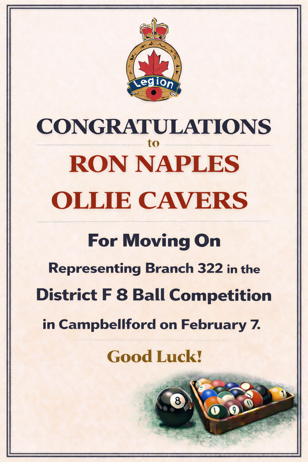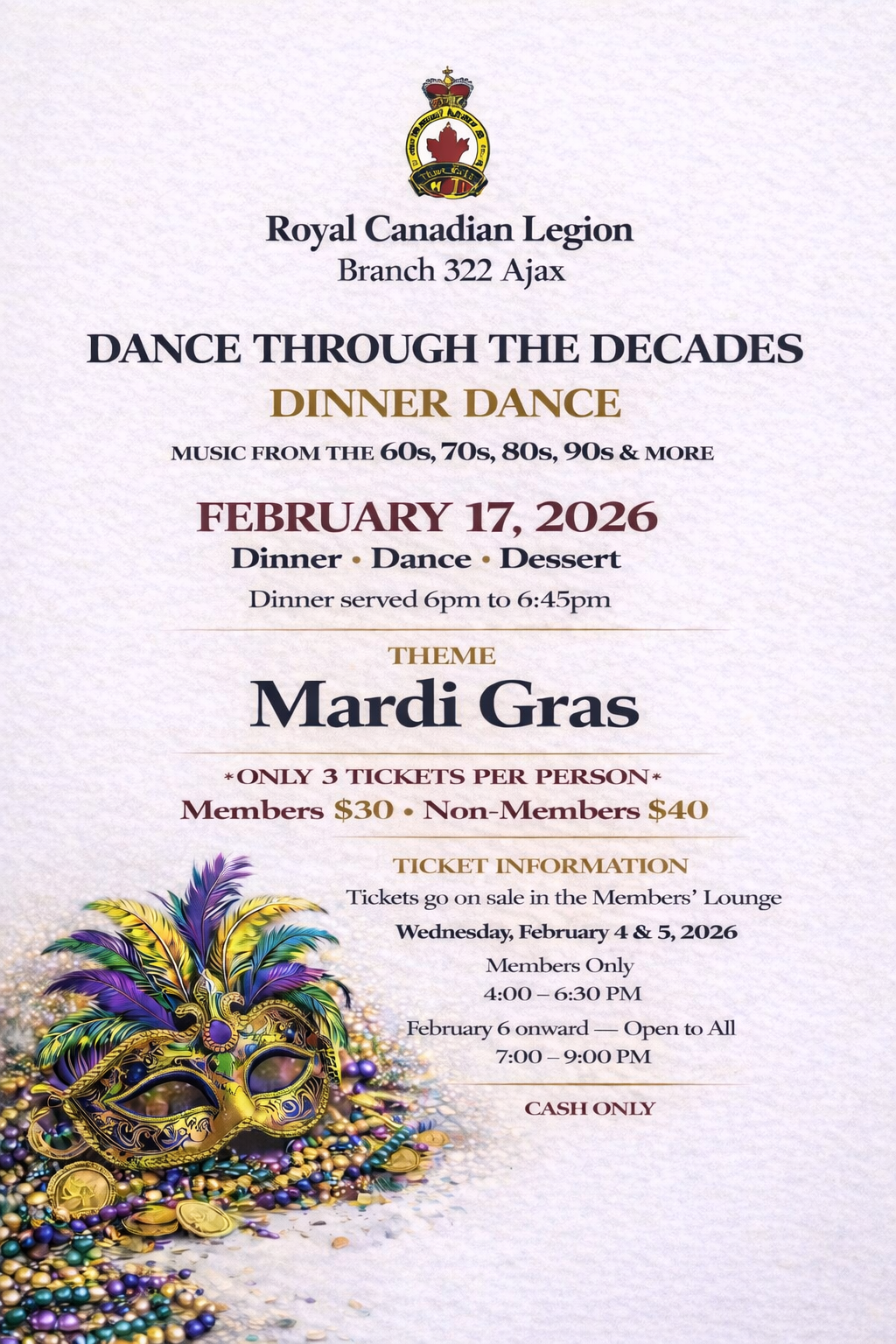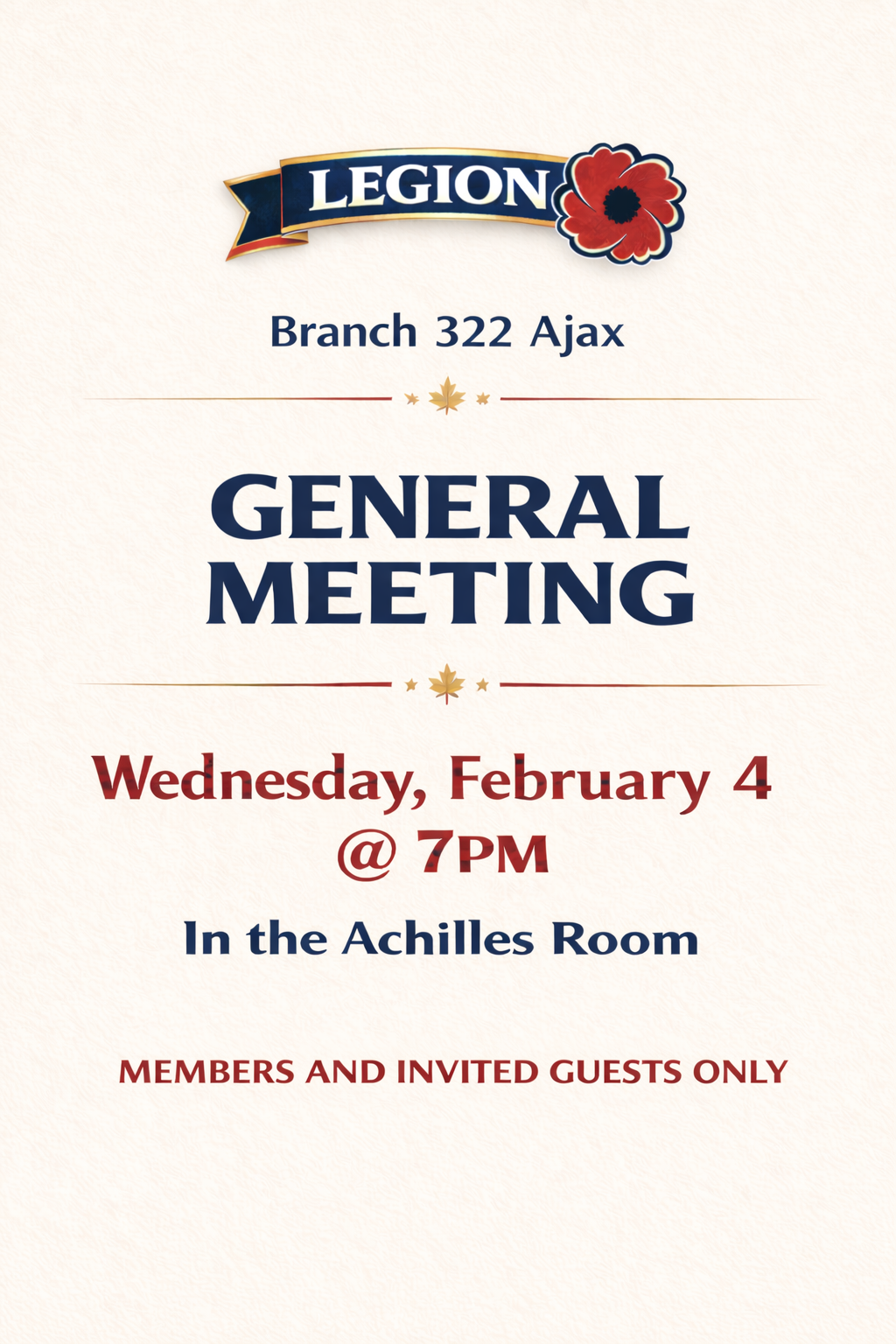 The Royal Canadian Legion Branch 322 serves Veterans, military families, RCMP members, and the community of Ajax through programs, support services, remembrance initiatives, and year-round events. Known as “The Friendly Branch,” Branch 322 remains committed to honouring Veterans and strengthening community connections.