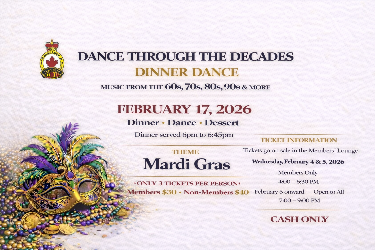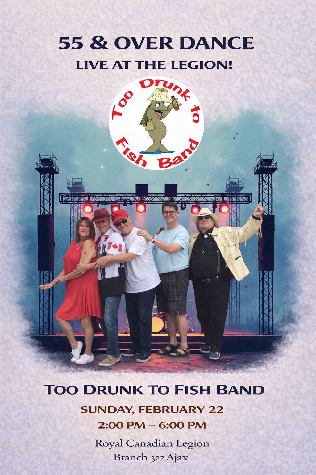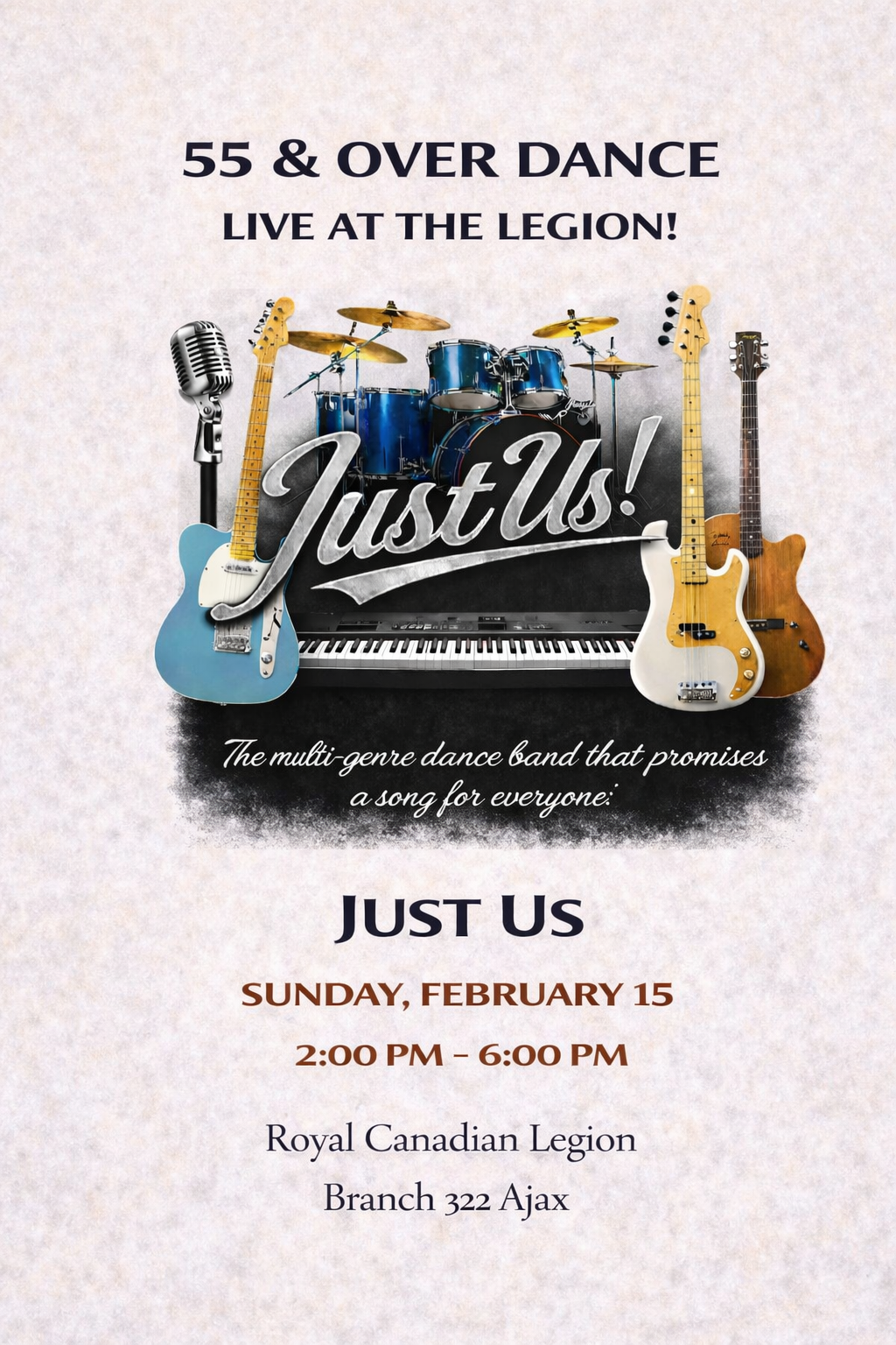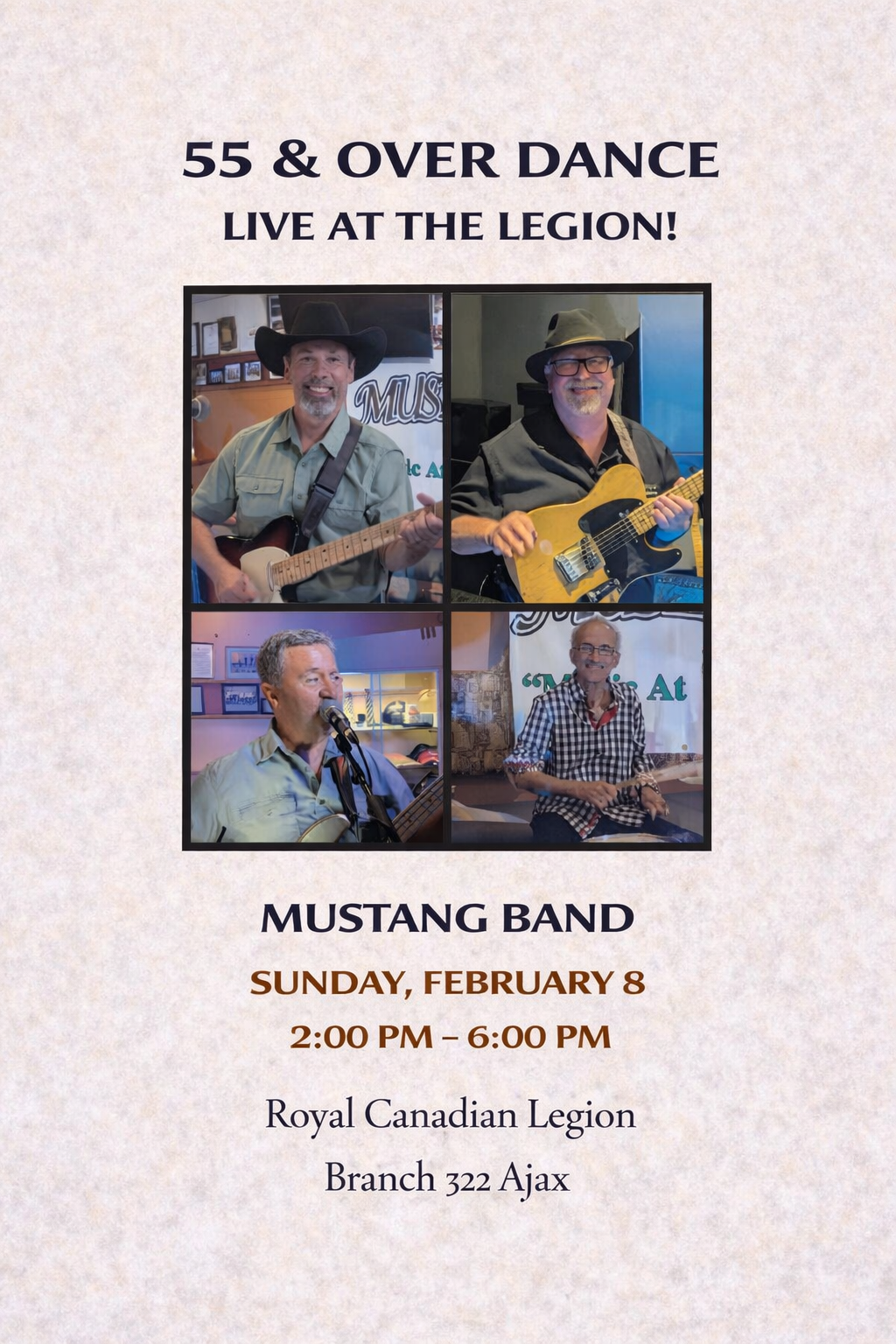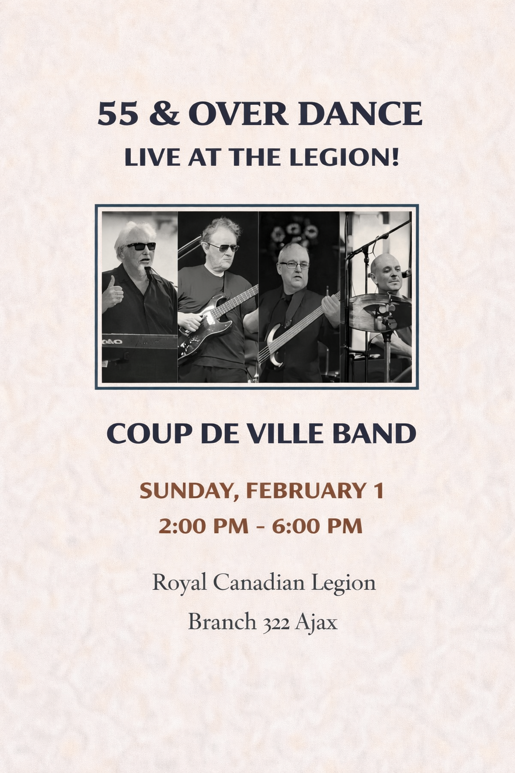- 55 and Over Dance Featuring The Coup de Ville Band - 2:00pm to 6:00pm - Clubroom Lounge - See upcoming bands at https://www.ajaxlegion.ca/55-and-over-dance-sundays