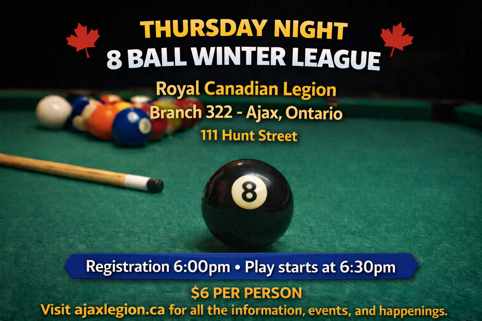- 8 Ball Winter League - 6pm Registration - 6:30pm Play Starts - $6 per person